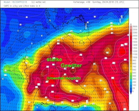 Ein langes Wochenende steht vor der Tür und da will man natürlich auch etwas im Freien unternehmen. Allerdings sollte man sich dafür nach Möglichkeit nicht unbedingt den Sonntag aussuchen, denn der bringt ab den Mittagsstunden aus Westen zum Teil käftige Schauer und Gewitter. Mit Ausnahme des äußersten Nordens können sich dann überall im Land zum Teik kräftige Gewitter bilden. Selbst Unwetter sind dann nicht ausgeschlossen.